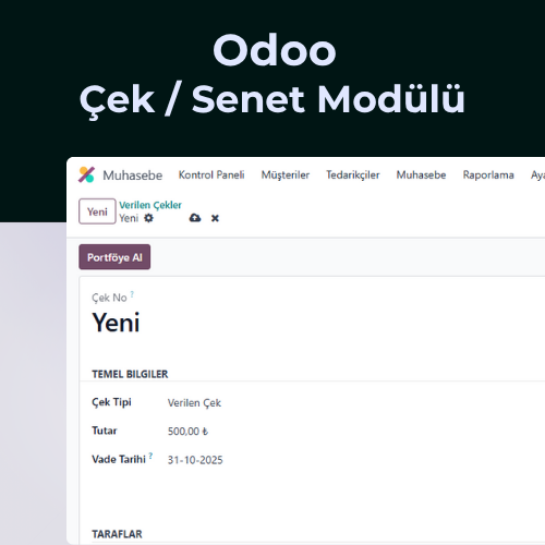 Odoo Çek-Senet modülümüz sayesinde alınan ve verilen çeklerinizi, senetlerinizi tek panelden kolayca yönetebilir; vade, portföy ve tahsilat süreçlerinizi anlık olarak takip edebilirsiniz.