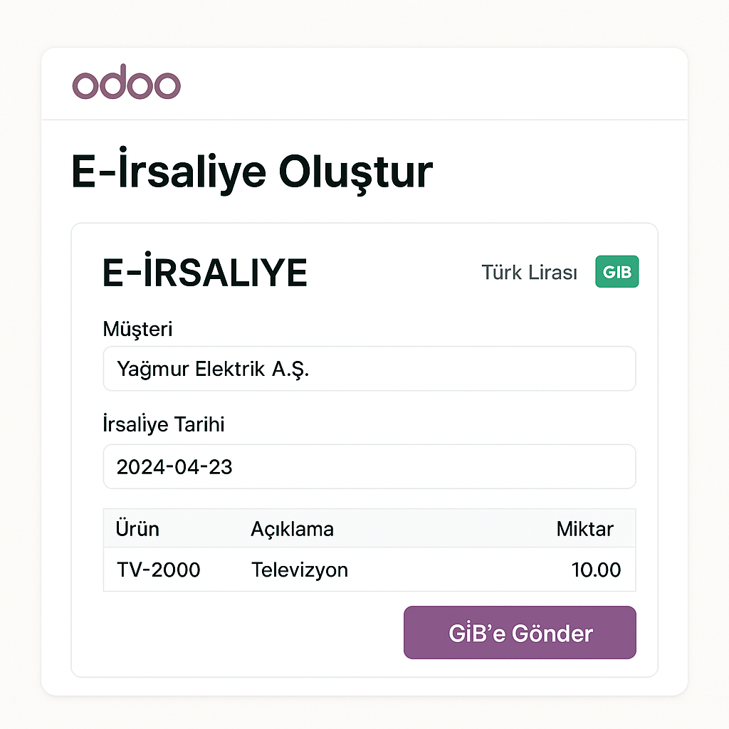Odoo e-İrsaliye modülümüzle sevkiyat belgelerinizi dijital ortamda oluşturun ve GİB’e anında iletin. Hızlı, güvenli ve yasal uyumlu bir çözüm sunuyoruz.