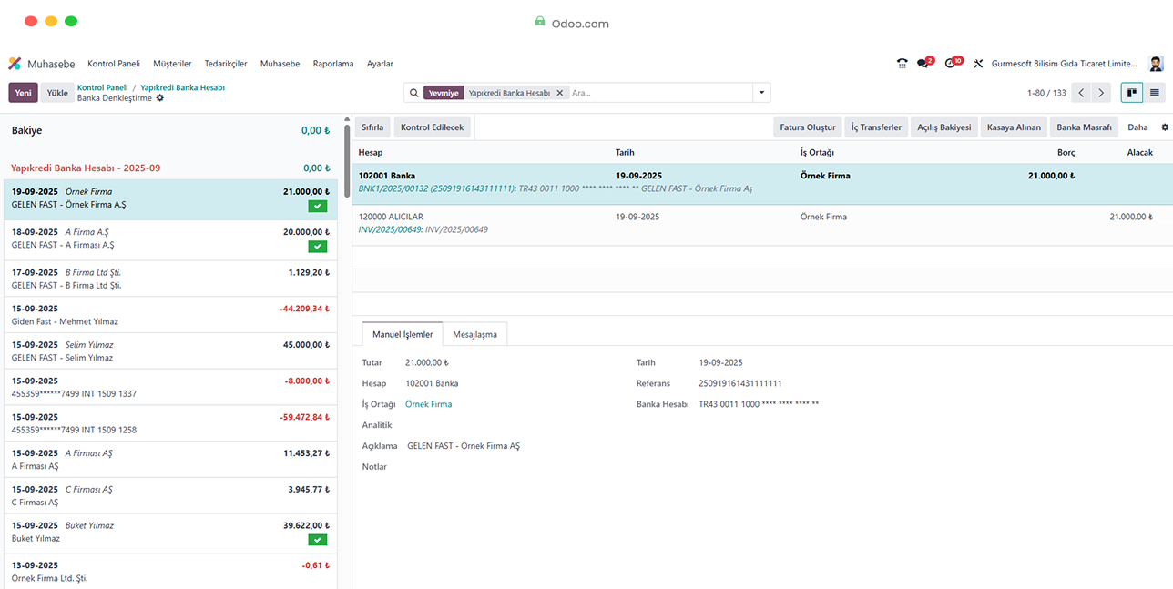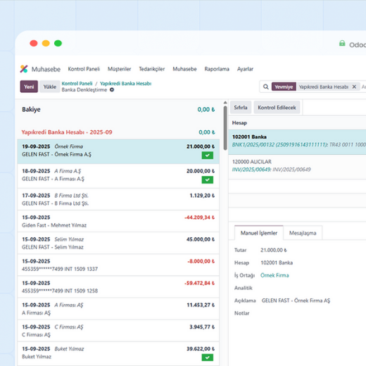 Banka hareketleri, otomatik olarak Odoo sistemine aktarılır ve her işlem kayıt altına alınır. Kullanıcılar bu hareketleri “kontrol edilecek”, “doğrulandı” veya “işlendi” gibi durumlarla işaretleyebilir.